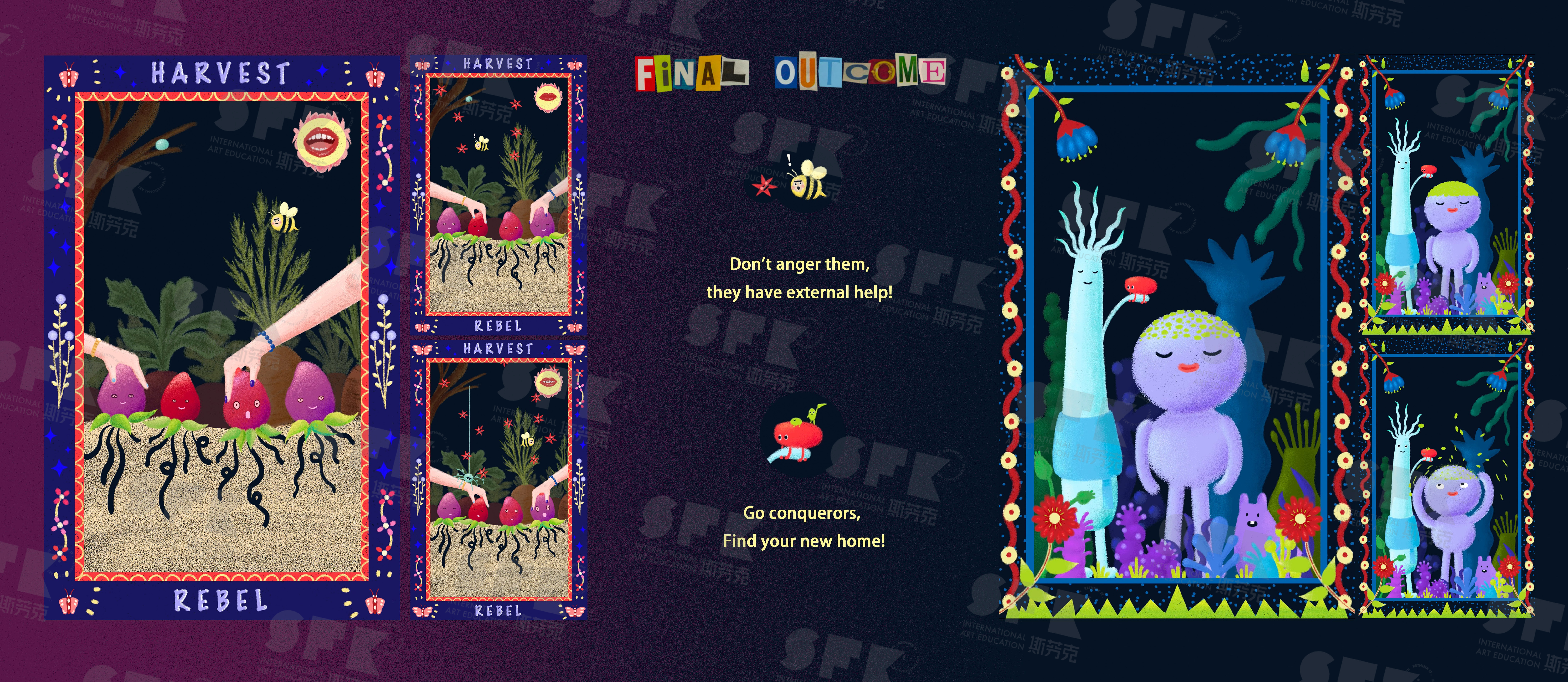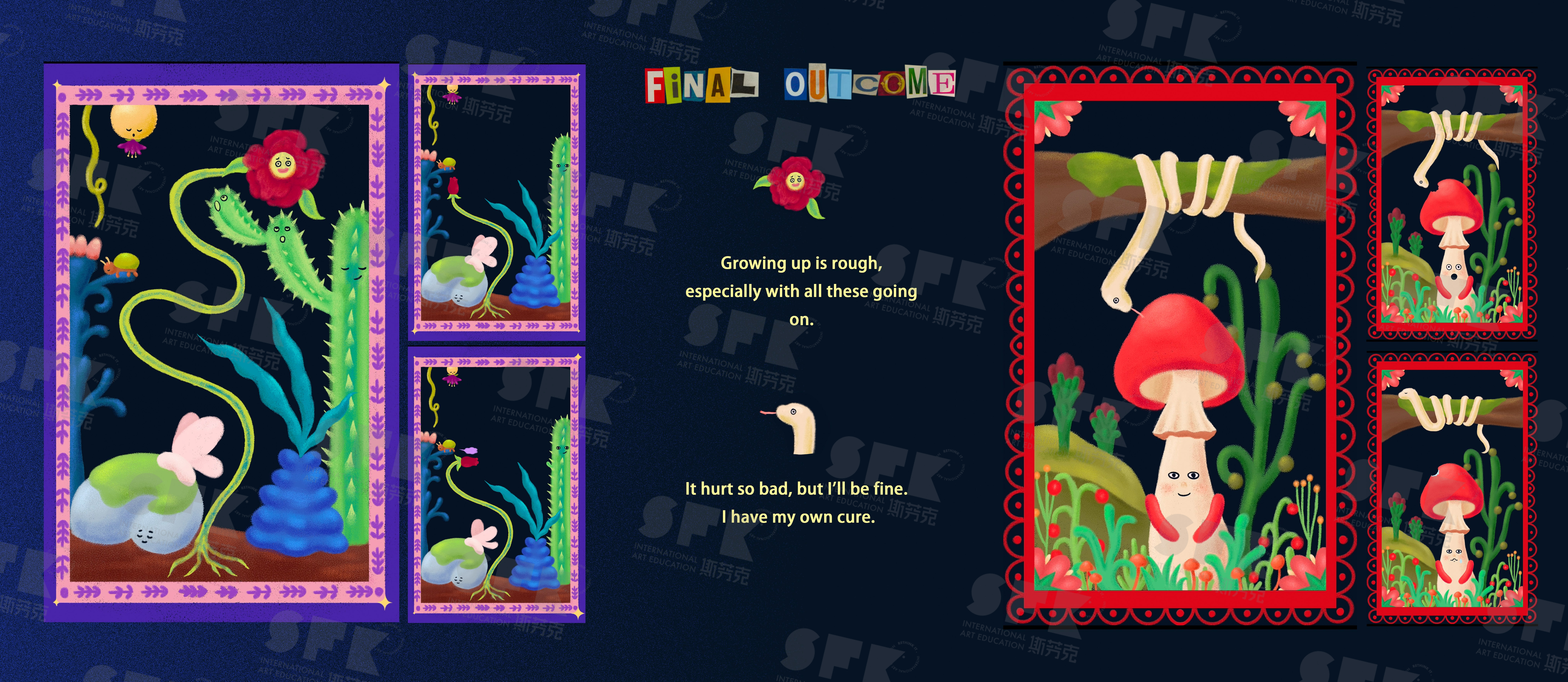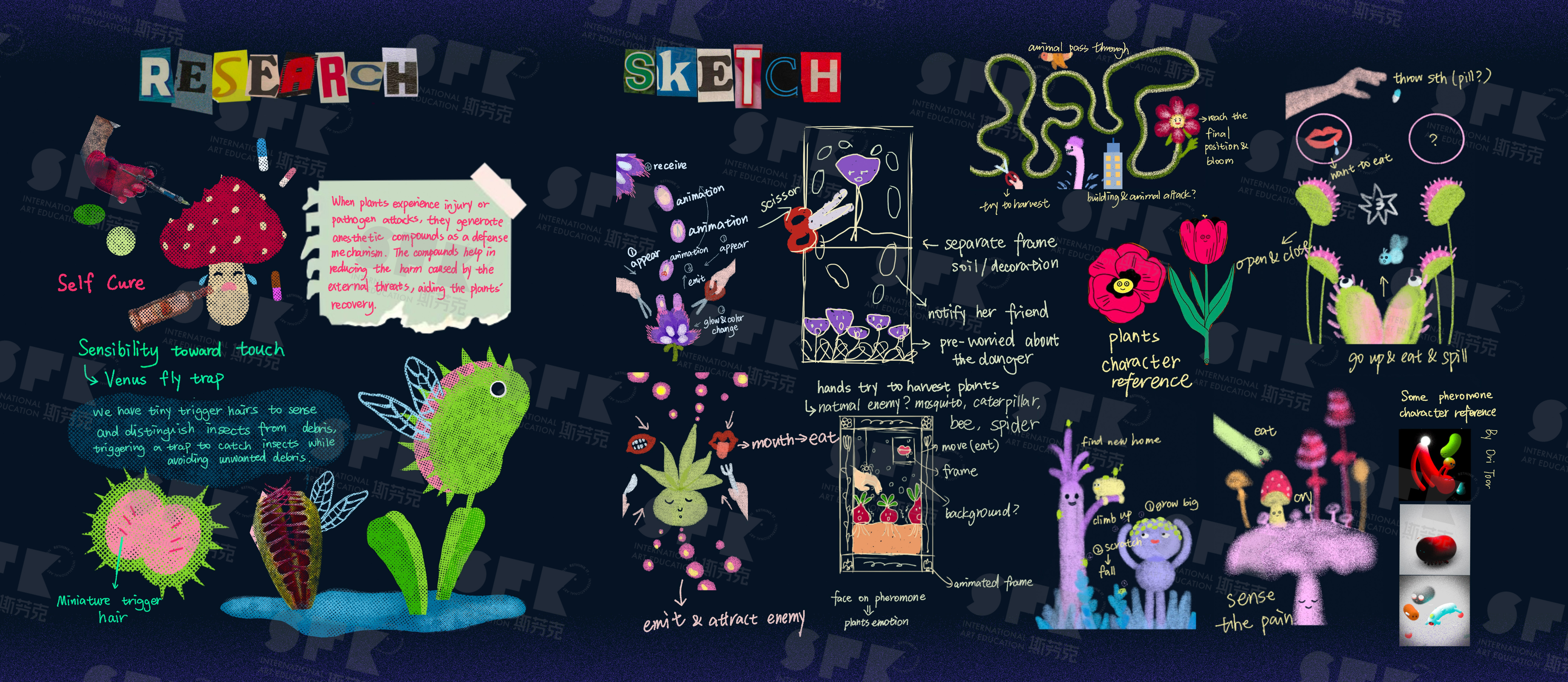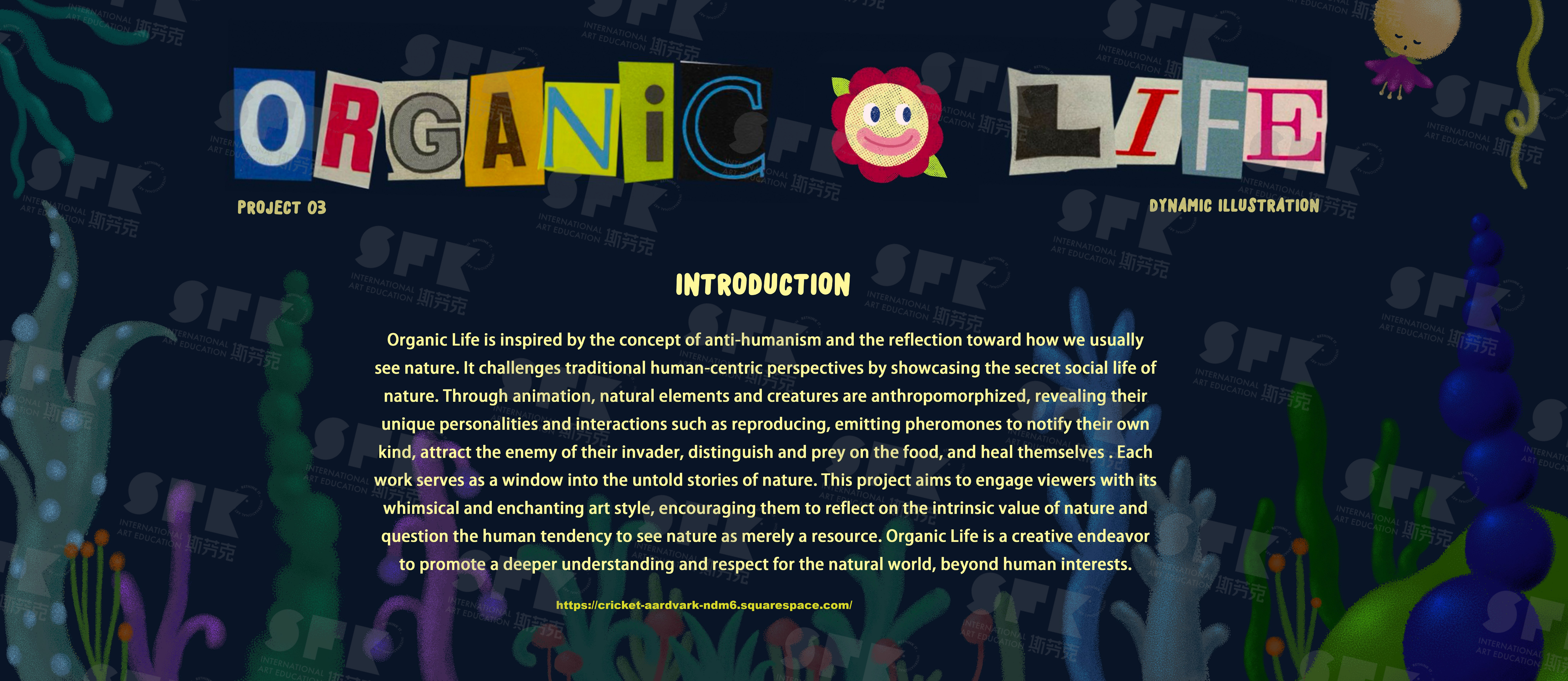 Organic Life is inspired by the concept of anti-humanism and the reflection toward how we usually see nature. lt challenges traditional human-centric perspectives by showcasing the secret social life of nature,Through animation nature elements and creatures anthropomorphized,revealing their unique personalties and interactions such as reproducing ,emitting pheromones to notify their own kind, attract the enemy of their invader, distinguish and prey on the food, and heal themselves . Each work serves as a window into the untold stories of nature. This project aims to engage viewers with its whimsical and enchanting art style, encouraging them to reflect on the intrinsic value of nature and question the human tendency to see nature as merely a resource. Organic Life is a creative endeavor to promote a deeper understanding and respect for the nature world,beyond human interests