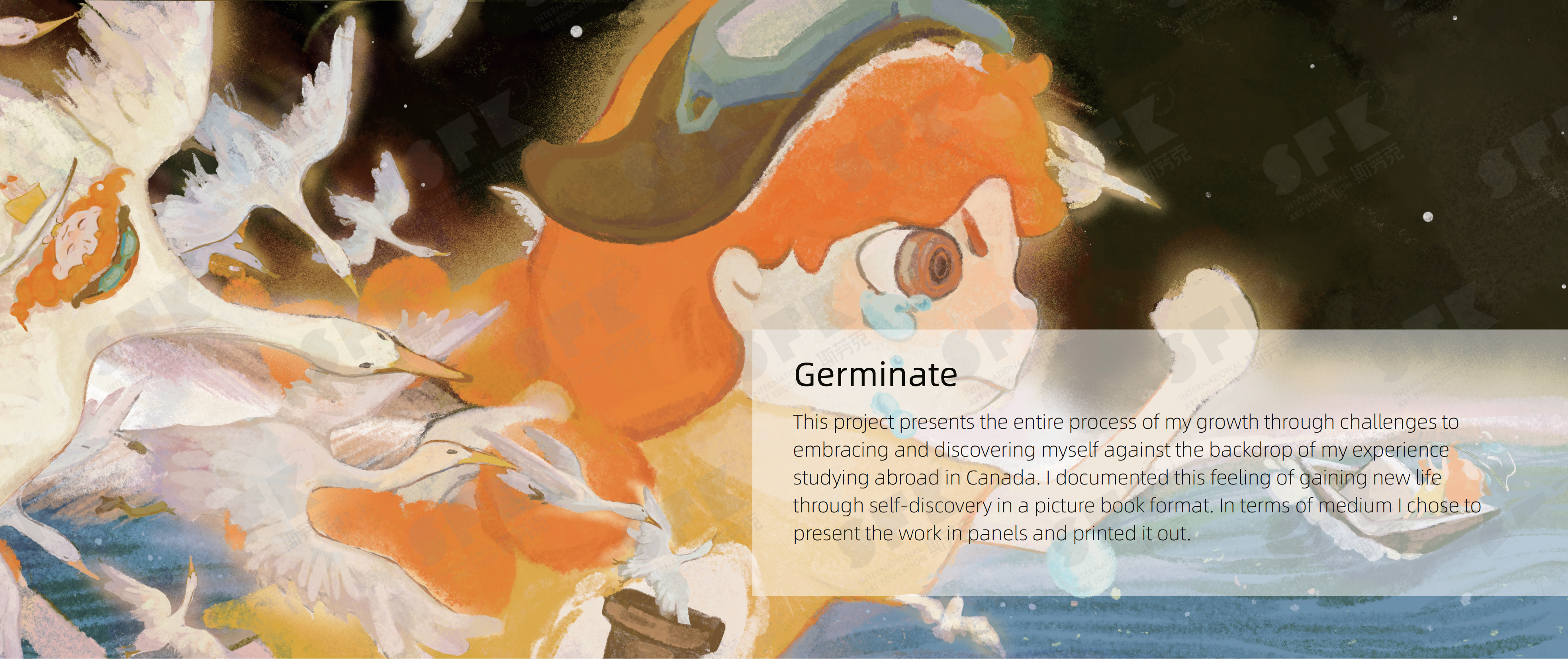 This project presents the entire process of my growth through challenges toembracing and discovering myself against the backdrop of my experiencestudying abroad in Canada. l documented this feeling of gaining new lifethrough self-discovery in a picture book format. in terms of medium l chose topresent the workin panels and printed it out.