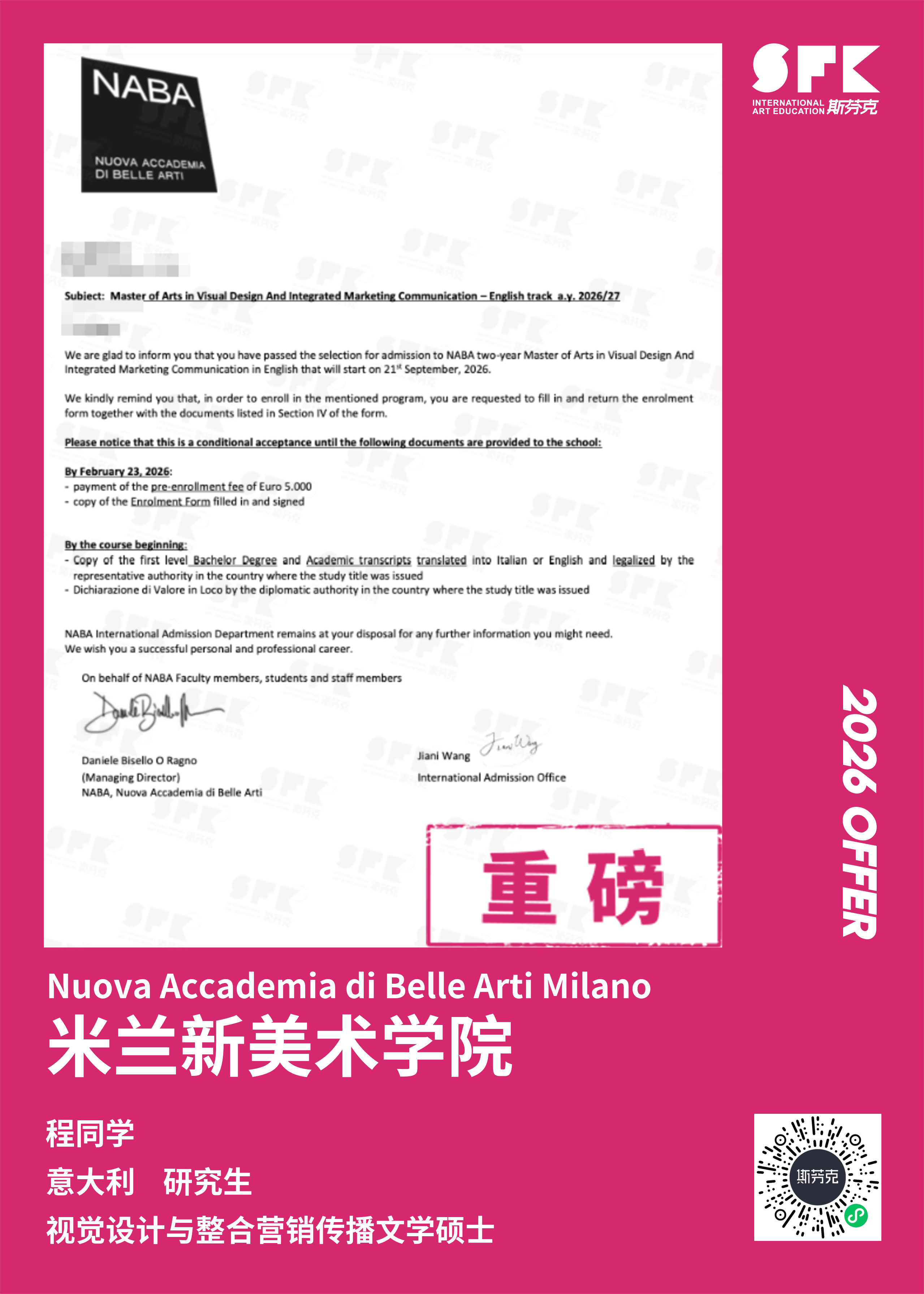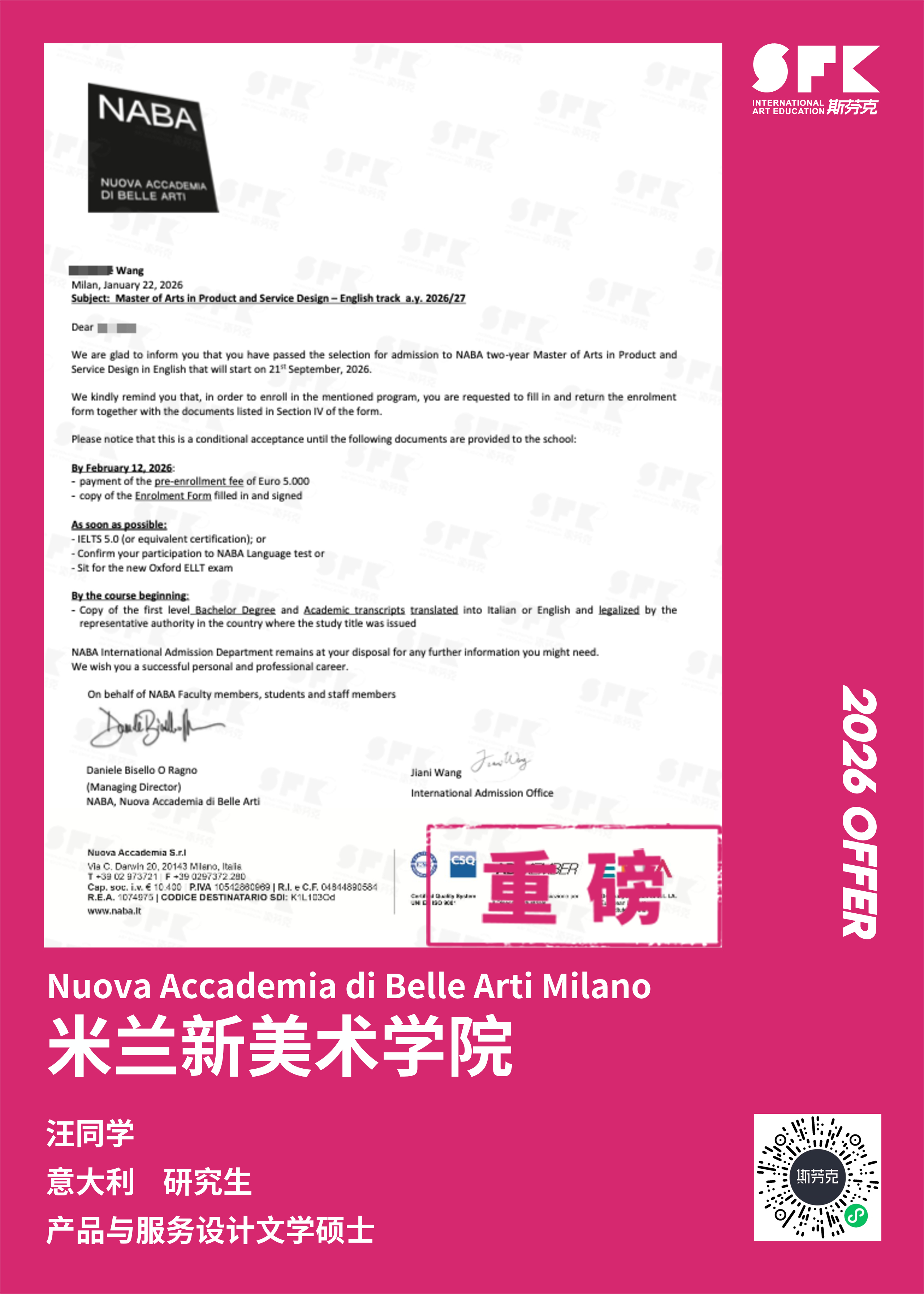 NABA米兰新美术学院,是意大利最大的私立艺术和设计学院,QS排名全球艺术与设计领域前100,NABA聘请行业专家,艺术导师等业内人士作为教师。教师团队汇集了世界TOP级艺术家及设计师。