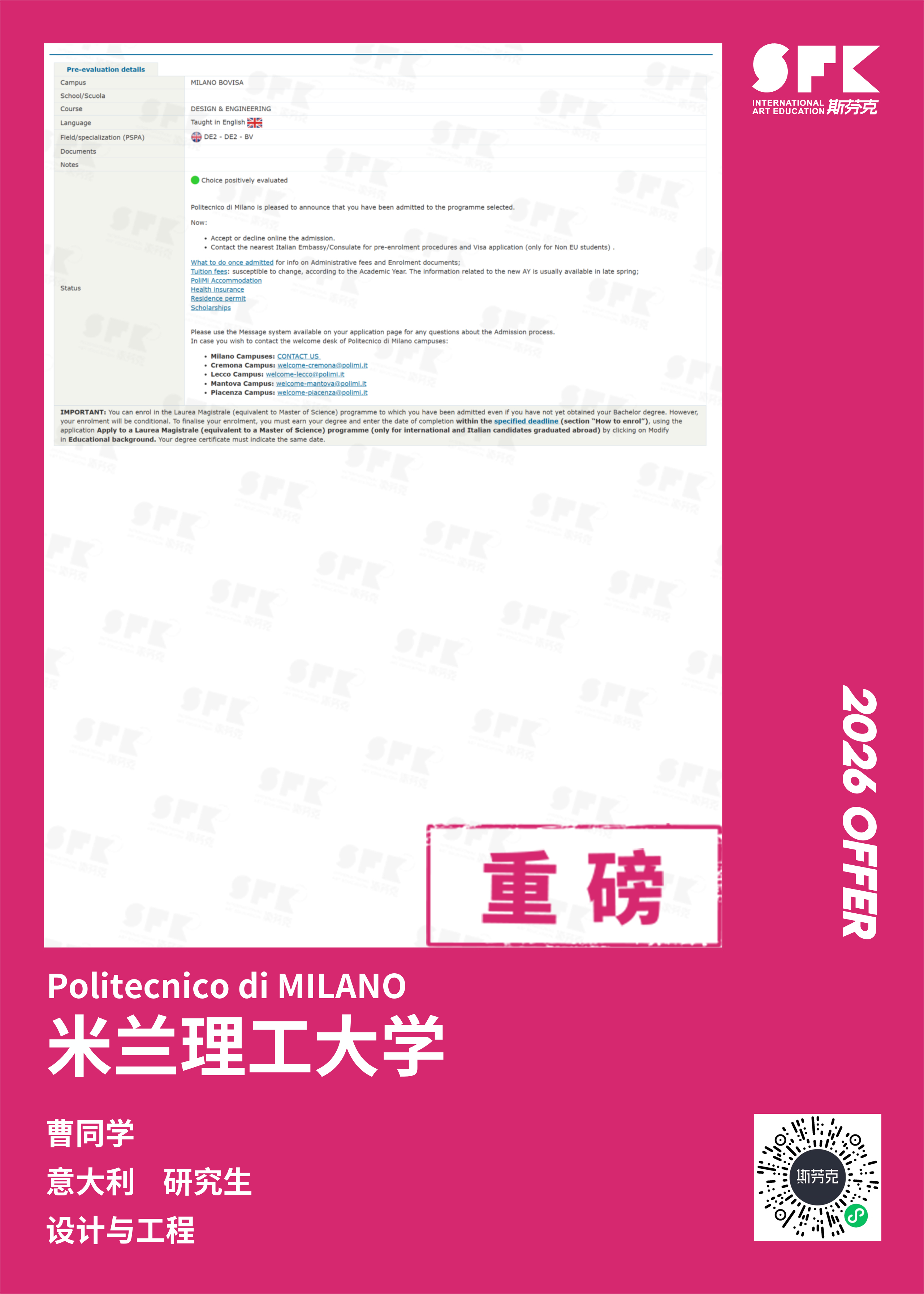 米兰理工大学是欧洲及世界上建筑,工程及工业设计等专业最好的高校,在建筑,设计和工程界享有极高的声誉,同时也是欧洲十强理工科院校之一。2024QS艺术与设计排名NO7。